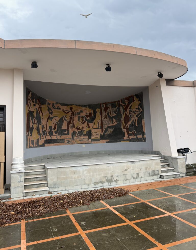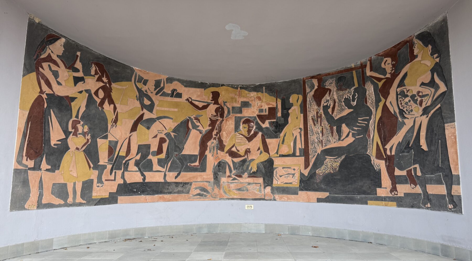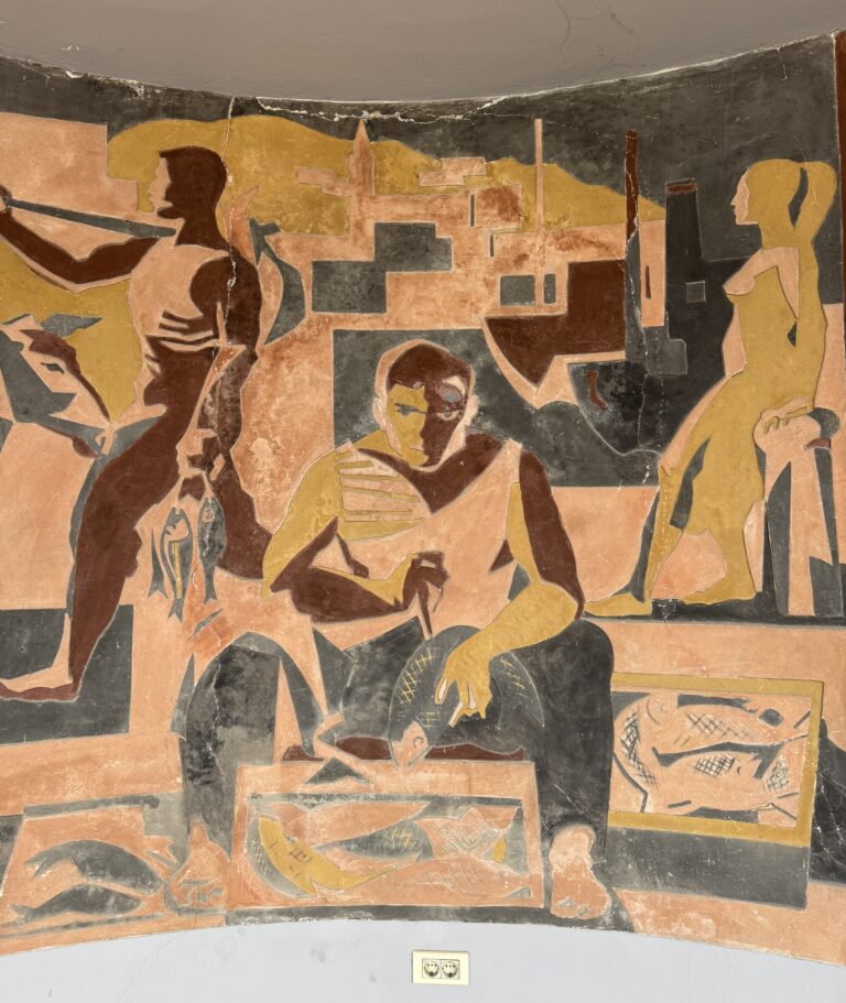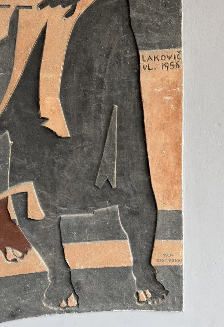 - Sgraffito iz petih barvnih plasti je na desni signiran »LAKOVIČ VL. 1965« in »1994 REST. V. SNOJ«. Umeščen je bil na ovalni oder za glasbenike v sklopu zunanje hotelske restavracije s plesiščem, danes je tu zgornji vrt muzeja. Na več mestih je razpokan in okrušen.